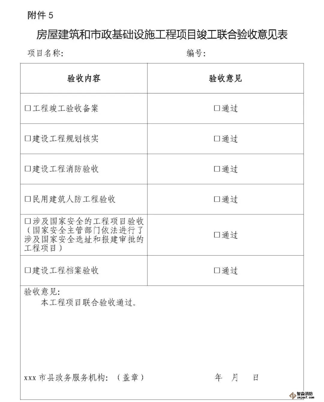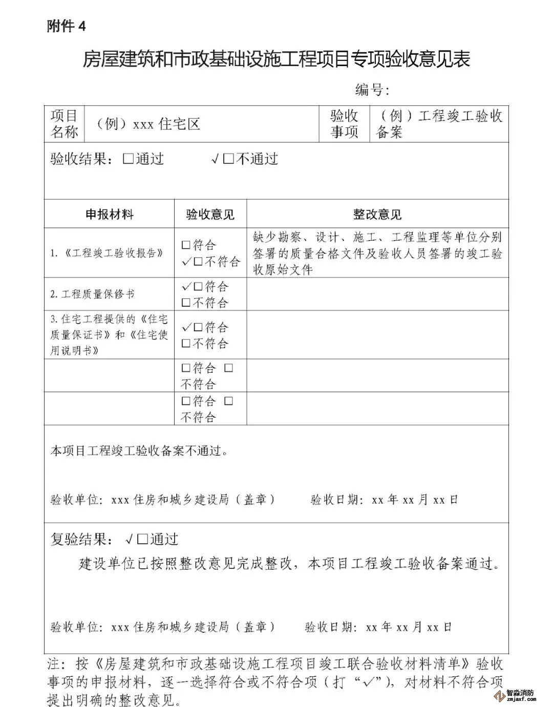 第十三條  各驗(yàn)收主管部門要按照工程項(xiàng)目驗(yàn)收情況,填寫《房屋建筑和市政基礎(chǔ)設(shè)施工程項(xiàng)目專項(xiàng)驗(yàn)收意見表》(以下簡稱《專項(xiàng)驗(yàn)收意見表》,見附件4),出具專項(xiàng)驗(yàn)收通過或不通過需要整改的意見,并送至綜合窗口;對專項(xiàng)驗(yàn)收不通過的工程項(xiàng)目,由綜合窗口統(tǒng)一匯總,一次性將整改意見反饋建設(shè)單位,整改時間不計(jì)入聯(lián)合驗(yàn)收時間。